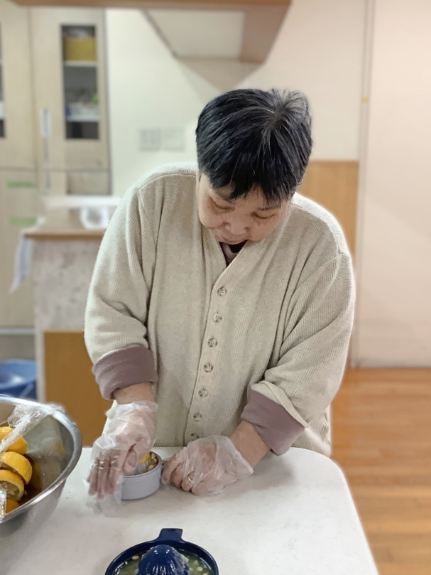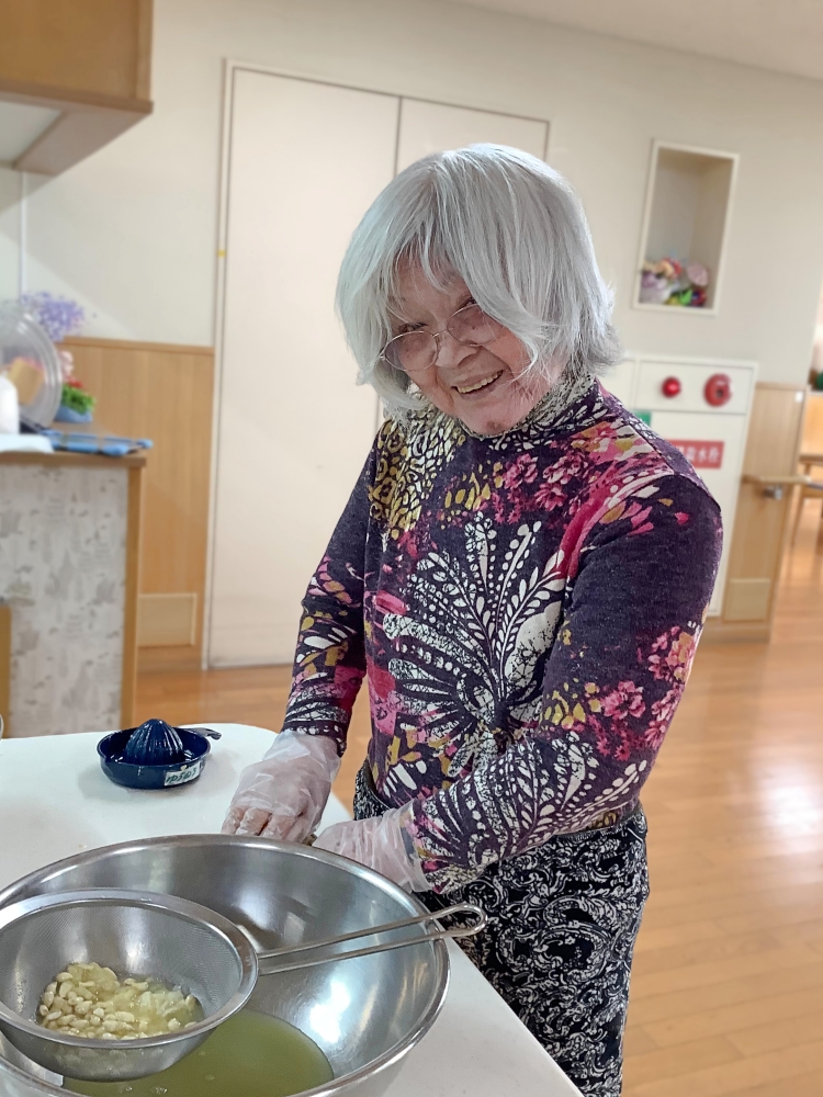 切ったゆずをご入居者にしぼっていただき、しぼり汁