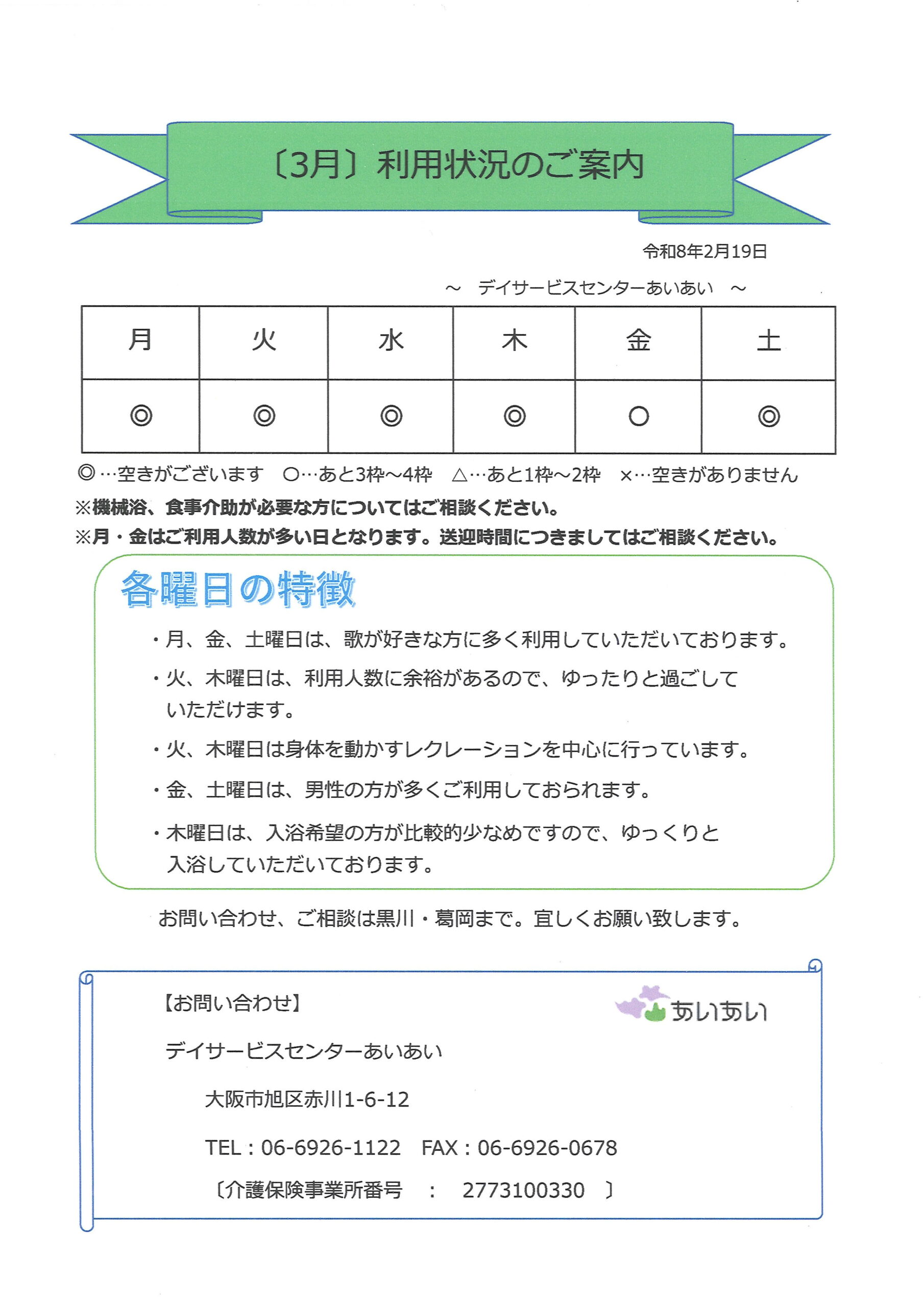 あいあいデイ:06-6926-1122(担当:黒川、葛岡)